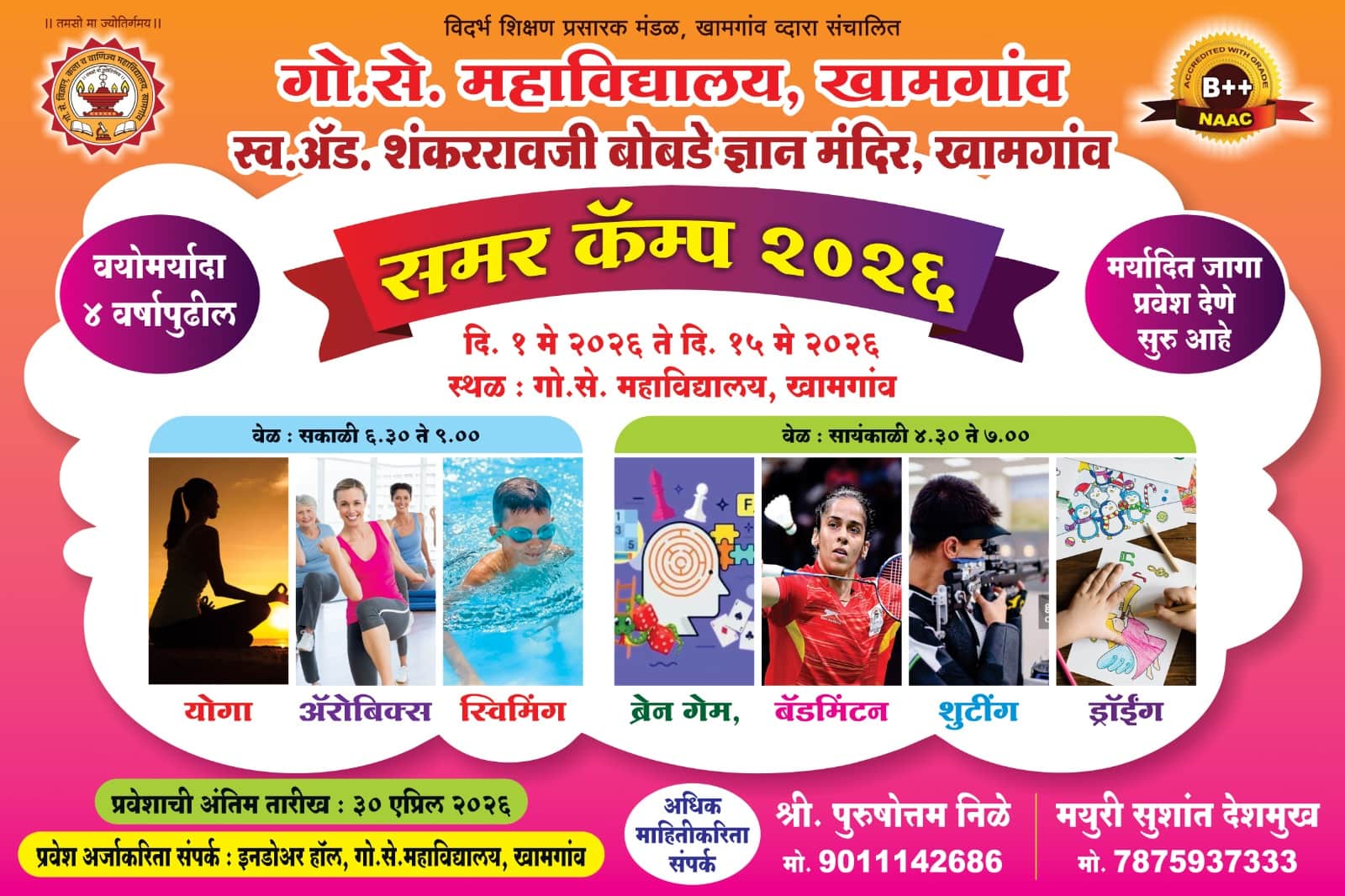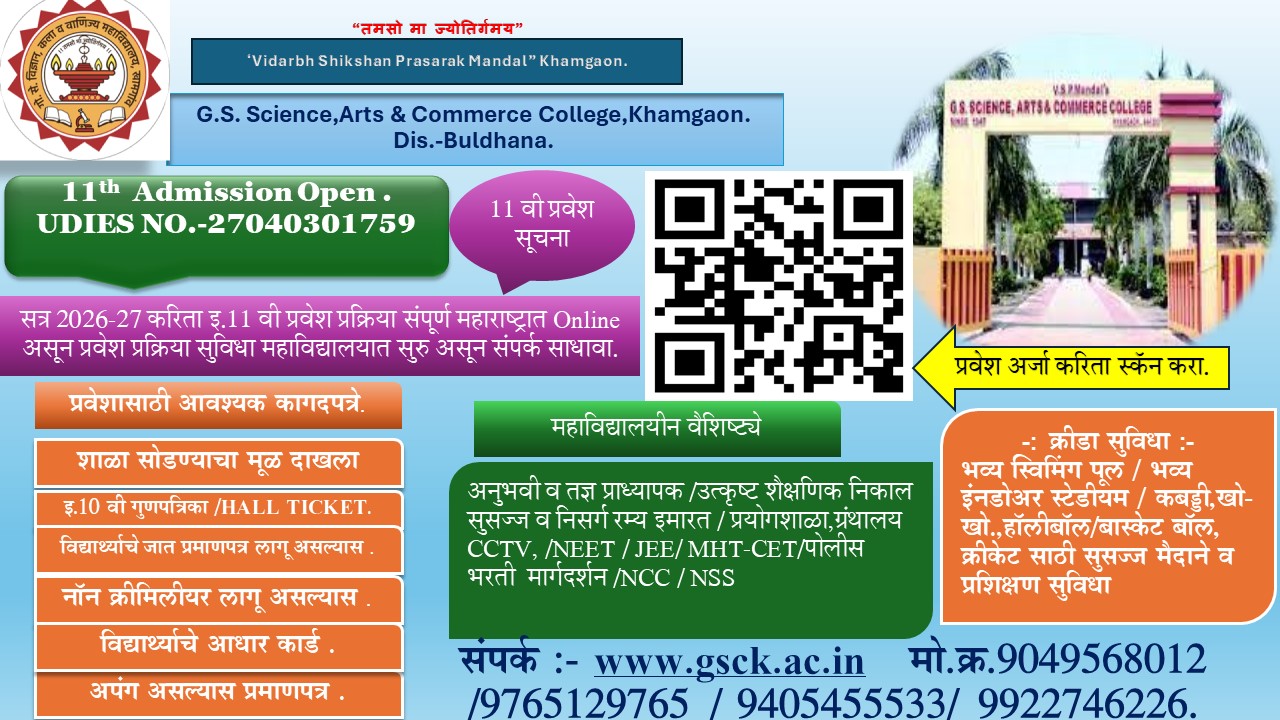 With Tamso Maa Jyotirgamaya as its guiding principle, the Vidarbha Shikshan Prasarak Mandal, Khamgaon founded the Govindram Seksariya Science College in 1947 with donation given by Late Seth Govindram Seksaria of Indore in order to cultivate the values of modesty, brotherhood, devotion, courage, patriotism, discipline, sacrifice, patience and determination in the youth of the post-independence era. . The late Advocate Raobahadur Anant Sakharam Athalye of Akola was the first president of the VSP Mandal while there were some prominent citizens of Khamgaon among the founder members. The VSP Mandal is registered under B.P.T. Act, 1950 with registration no. F-1 Buldana. The college has its own spacious building with total campus area of 97 acres.